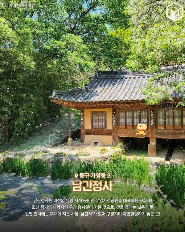 다섯번째로 추천드리는 대전 가볼만한 곳은 남간정사입니다. 넓은 연못 앞에 나지막한 기와지붕이 앉아 있고, 주위로는 대나무 숲과 키 큰 나무들이 그림처럼 펼쳐져 있는 이색 대전 여행지인데요.