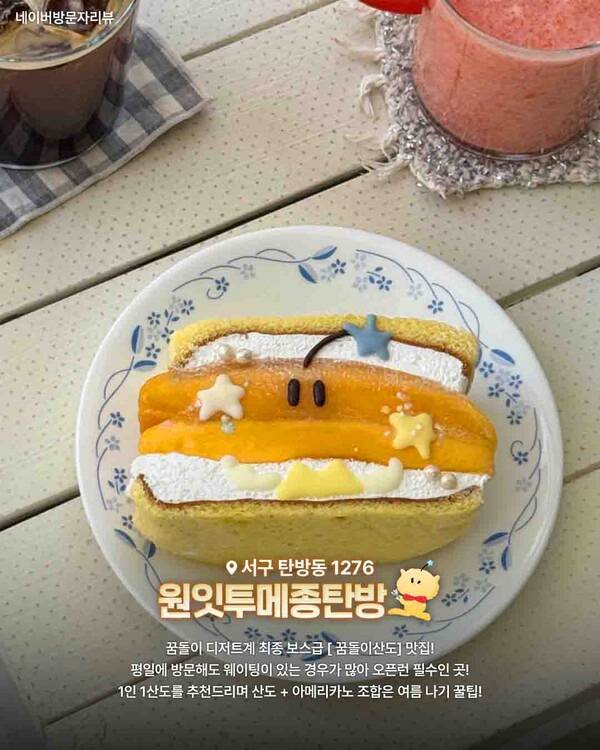 망고, 생크림, 부드러운 카스텔라가 조화를 이루는 맛으로 아메리카노랑 먹으면 더 완벽하니, 1인 1산도 꼭 하세요! 웨이팅이 조금 있었지만 기다린 보람 100%인 대전 가볼만한 곳입니다.