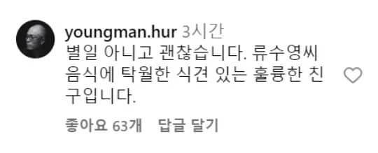 그는 "별일 아니고 괜찮습니다. 류수영씨 음식에 탁월한 식견 있는 훌륭한 친구입니다"라고 류수영을 옹호했습니다.