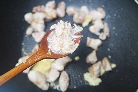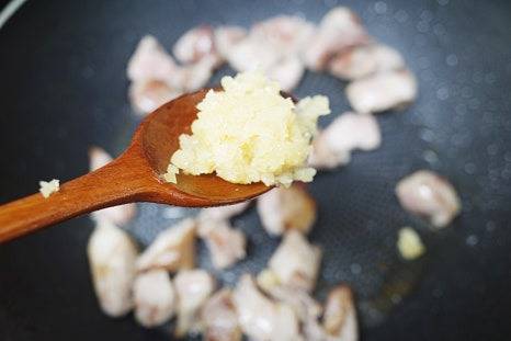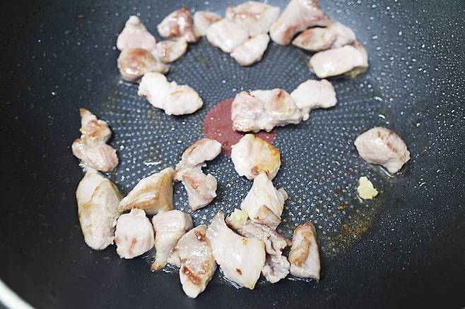 고기가 노릇하게 익으면 다진 마늘 1스푼과 새우젓 1스푼을 추가해 함께 볶아줍니다.