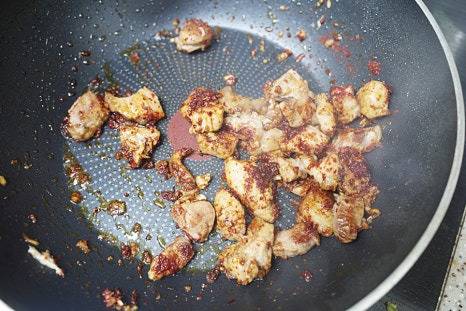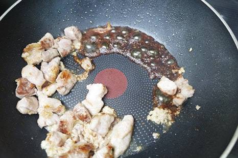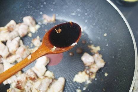 볶은 고기를 한쪽으로 밀어두고, 빈 공간에 진간장 2스푼을 넣어 살짝 조립니다.
