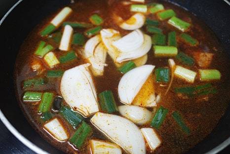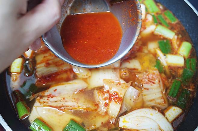 끓어오르면 양파, 대파, 김치, 김치국물을 넣어주세요