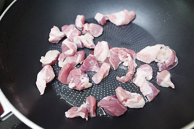 냄비를 예열한 뒤 식용유를 1바퀴를 두르고 돼지고기를 넣어 중불에서 볶아주세요!