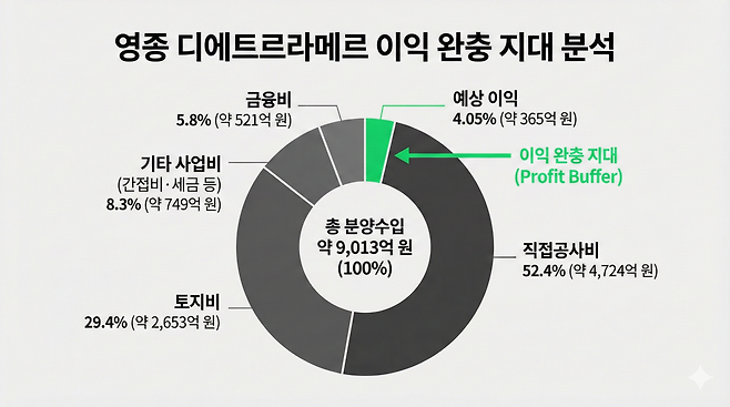 수익 구조가 취약한 원인은 전체 매출의 절반 이상을 차지하는 높은 공사비 비중이다. 직접공사비는 약 4724억원으로 총 분양수입의 52.41%에 달한다. 여기에 토지비와 금융비용을 합산하면 전체 매출의 87.6%가 분양 성적과 무관하게 지불해야 하는 고정비 성격의 비용이다.