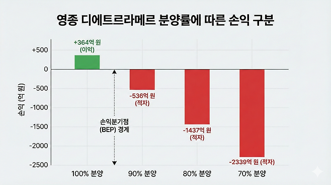한편 분양률 100%를 가정해도 예상 개발이익은 전체 매출의 4.05%인 365억원 수준에 불과하다. 분양률이 90%로 하락할 경우 약 901억원의 분양수입 공백이 발생한다. 이 수입 감소분은 전체 예상 이익인 365억원을 두 배 이상 웃도는 규모다. 결국 고정비를 충당하지 못해 곧바로 536억원대의 세전 적자로 전환되는 구조다.