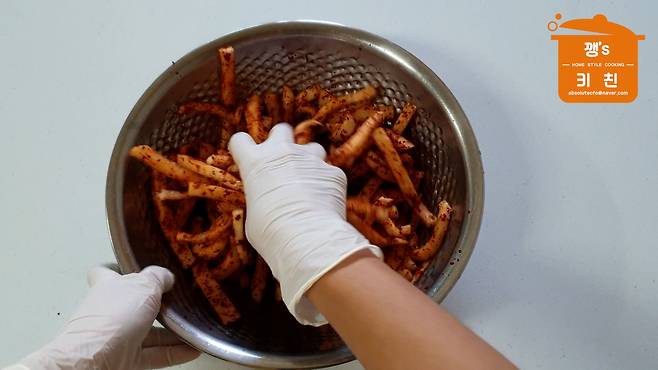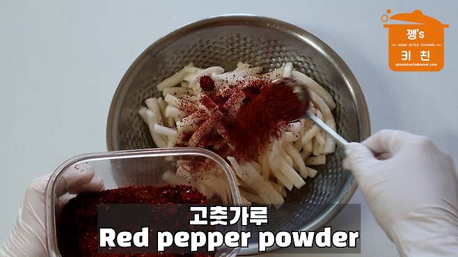 물기 짠 무에 고춧가루 3큰술을 넣어