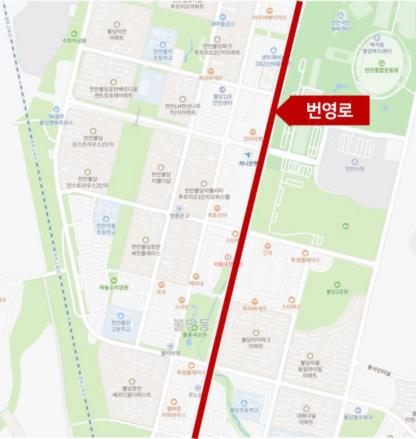 불당동은 불당동 한복판을 가로지르는 왕복 10차로 번영로를 중심으로 서쪽이 ‘신불당’, 동쪽이 ‘구불당’으로 나뉜다. 지어진지 20년 정도 된 구불당이 준공 3~5년차 아파트가 밀집한 신불당 아파트에 비해 회복세가 더뎌 양극화되고 있었다.