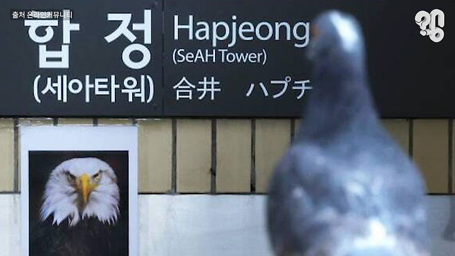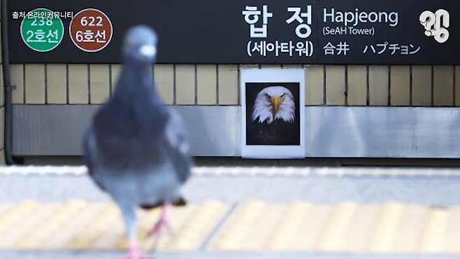온라인에서 화제가 됐던 합정역 독수리 사진. 이것도 비둘기를 쫓아내려고 붙였던 건데, 별 효과가 없다는 목격담이 대다수.
