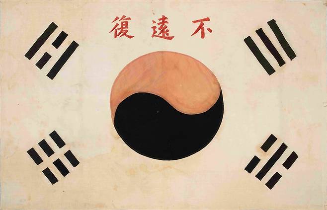 | ▲ 국가등록문화유산으로 지정된 ‘불원복’ 태극기. 고광순 의병장이 태극 문양 위에 붉은 글씨로 ‘머지않아 국권을 회복한다’는 뜻의 ‘不遠復’을 수놓았다. |