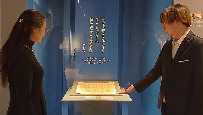 | ▲ 이순신 장군이 자필 서명한 신군안 의병장 임명첩 앞에 선 전은진 남도의병 전시해설사(왼쪽). 의병장 임명첩은 이순신 장군이 직접 수결(手決)해 발급한 유일한 것이다. |