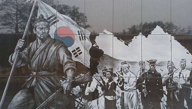 | ▲ 남도의병역사박물관 벽면 전시 그림. 대한제국 시기의 의병 모습을 표현하고 있다. |