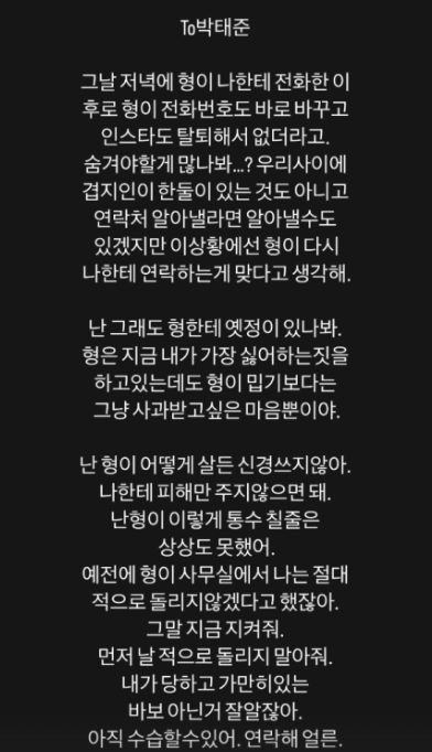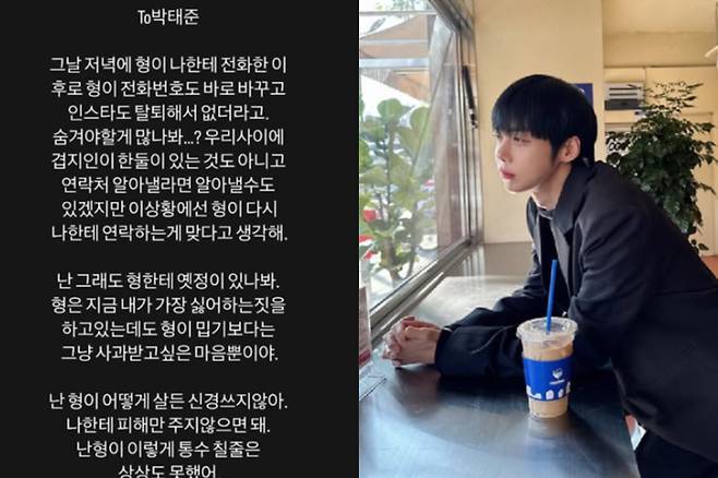 그는 “그날 전화 이후 번호도 바꾸고 인스타그램도 탈퇴했더라. 숨겨야 할 게 많나 봐?”라는 말로, 박태준의 갑작스런 SNS 계정 삭제와 연락 단절을 지적했다.