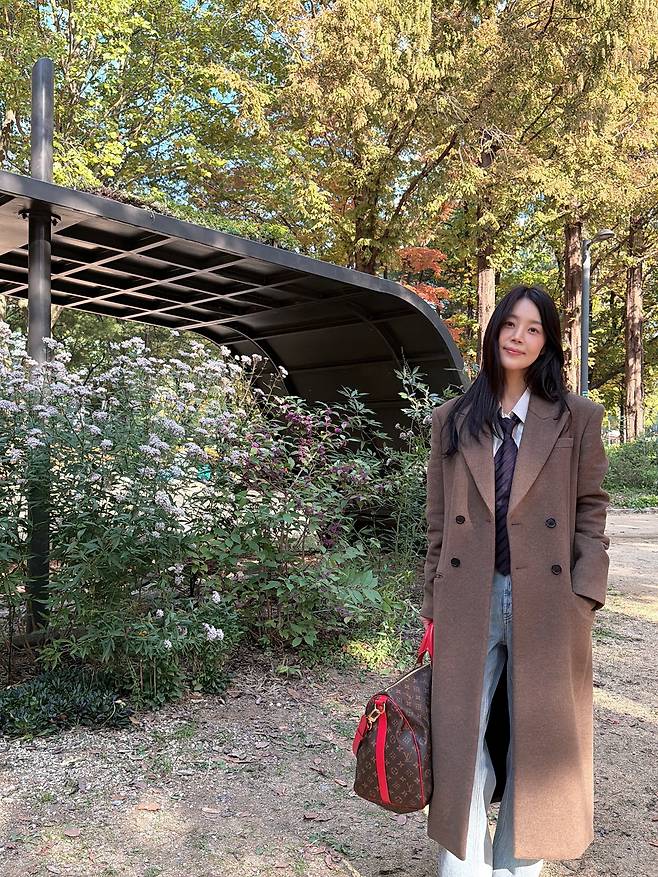 한지혜의 이번 가을 스타일은 클래식과 여유가 절묘하게 섞여 있어요.