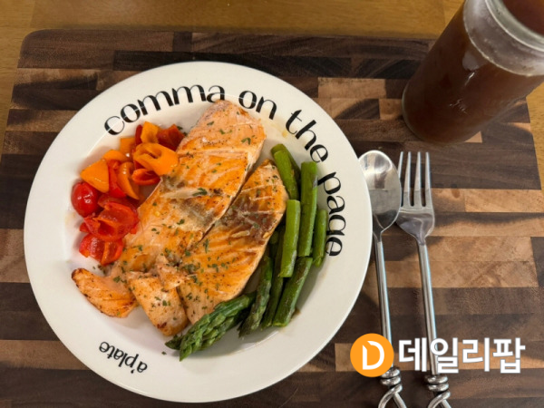 3. 연어와 곁들임 채소에 올리브 오일을 뿌린다. 레몬즙이 있다면 뿌리면 좋다. 비린내를 잡아준다.