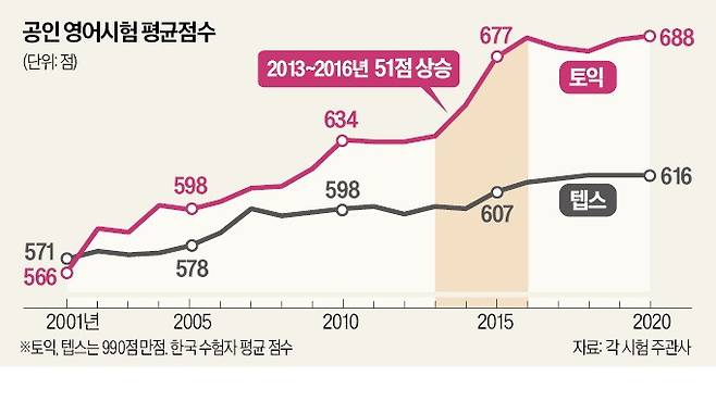 지난 20년간 텝스(TEPS)와 토플(TOEFL) 등 다른 영어시험에선 한국인의 평균 점수가 8~16% 오르는 동안 토익만 22% 이상 올랐기 때문이다.