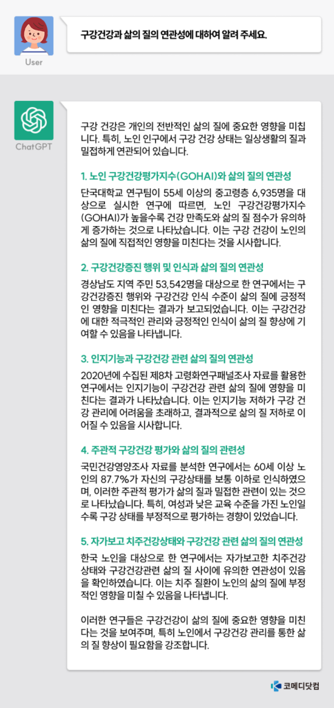 삶의 질은 개인의 주관적인 평가와 객관적인 생활 조건이 복합적으로 작용해 결정되므로, 전인적인 접근이 필요합니다. 이를 위해 올바른 구강건강 관련 지식 및 건강관리 노력과 함께 사회적, 정책적 지원이 필요합니다.
