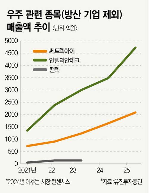 우주 지상국 서비스·위성영상 전문 기업 컨텍도 다수 전문가가 주목한다. 특히 지상국 설계 구축 통합 서비스를 제공하는 컨텍의 경우, 위성 수가 많아질수록 지상국 설치 수요가 늘어난다는 점에서 수혜가 예상된다. 지난해 실적 기준 매출에서 지상국 시스템 엔지니어링 솔루션이 차지하는 비중이 80%에 육박한다. 주가 상승 여력도 충분한 편이라는 진단이다. 메리츠증권은 컨텍 목표주가를 2만5000원으로 제시했다. 6월 12일 종가(1만5840원) 대비 약 58% 높은 수준이다. 정지수 메리츠증권 애널리스트는 “컨텍은 정부 국책 과제 중심의 지상국 구축 사업 호조로 예상보다 큰 폭으로 매출이 성장 중”이라고 분석했다.
