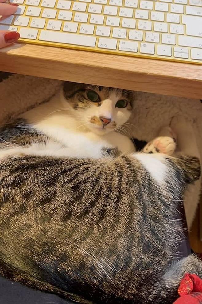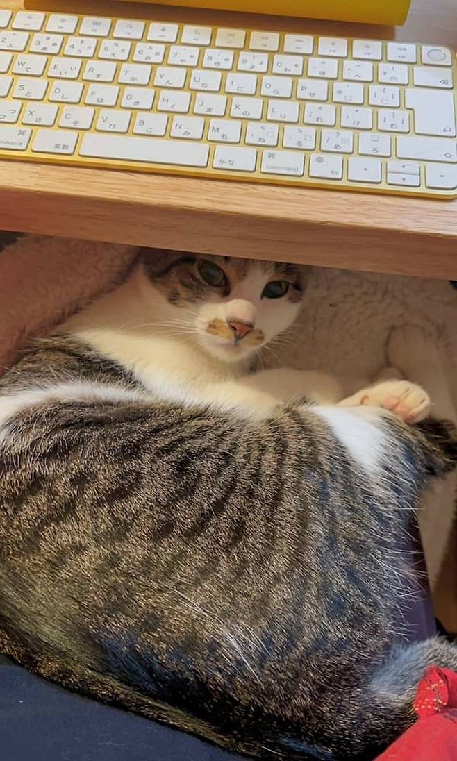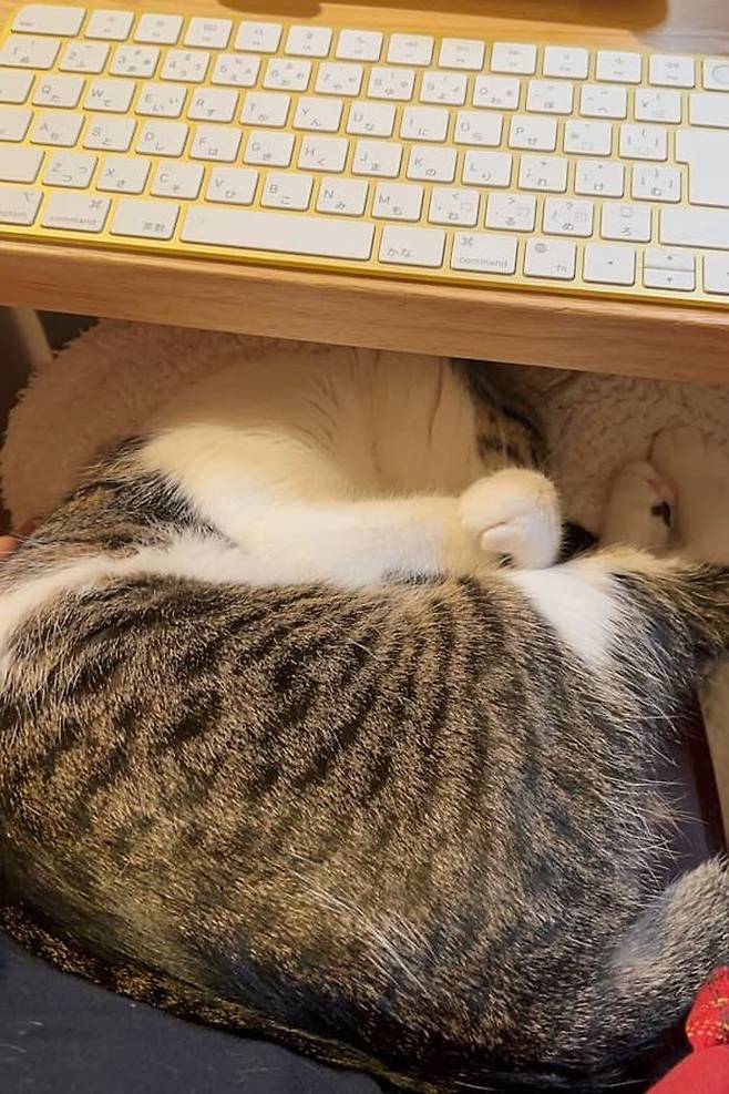 사연은 이렇습니다. 고양이를 키우는 집사는 SNS를 통해 키보드 밑에 구석진 자리에 누워서 일어날 생각이 없는 고양이 사진을 공개한 것.