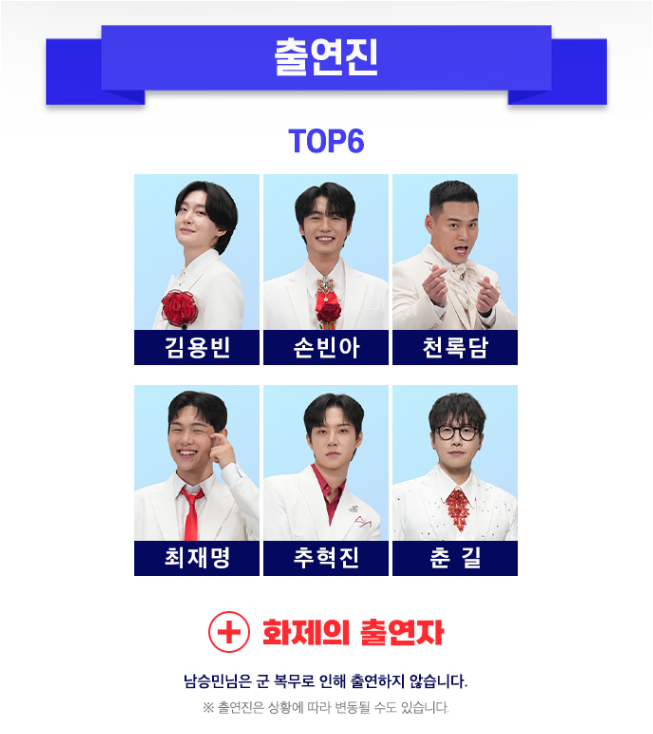 이번 콘서트에서는 미스터트롯3에서 선발된 TOP7이 무대를 꾸밀 예정이에요. 김용빈, 손빈아, 천록담, 최재명, 추혁진, 춘 길 등 실력파 가수들이 각자의 개성을 담은 무대를 선보일 거예요. 다만, 남승민은 군 복무로 인해 콘서트에 참여하지 못한다고 해요. 다양한 감성과 개성이 가득한 무대를 직접 만나볼 수 있는 절호의 기회이니 기대하셔도 좋아요!