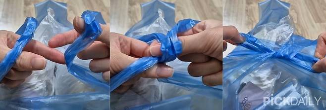 또한 가득찬 종량제 봉투를 묶을 땐 일반적인 매듭 방법보다 더 좋은 방법이 있다. 먼저 양쪽 손잡이에 손을 넣고 고리를 만들어준다. 왼쪽 검지는 오른쪽 손잡이에, 오른쪽 검지는 왼쪽 손잡이에 걸어 양쪽을 쭉 당겨준 뒤 묶으면 끝이다. 그 위로 짧은 부분을 묶어주면 된다. 이렇게 쓰레기 봉투를 묶으면 넘칠 것 같던 봉투도 쉽게 묶이고, 쓰레기 봉투가 가득 차 있더라도 편하게 묶을 수 있다. 봉투에 들어가는 쓰레기 양도 훨씬 많아진다.