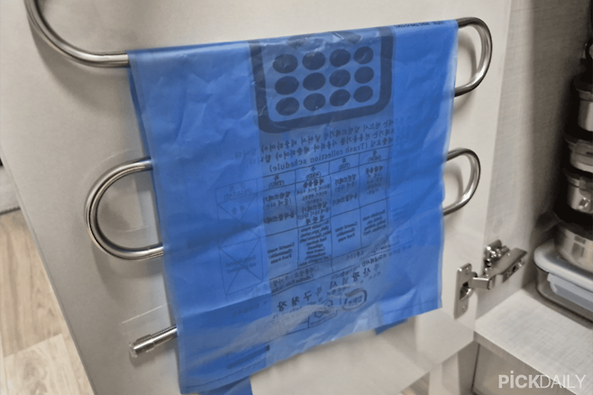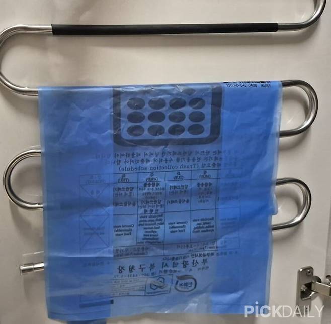 여러단으로 나늰 바지 걸이를 이용하면 다양한 용량의 쓰레기 봉투를 구분해 걸 수 있어 좋다. 용량이 보이는 쪽으로 걸어두면 한 눈에 보기 편하니 쏙쏙 뽑아쓰면 된다. 바지걸이가 없다면 집에 뒹굴어 다니는 세탁소 철사 옷걸이를 이용해도 좋다.