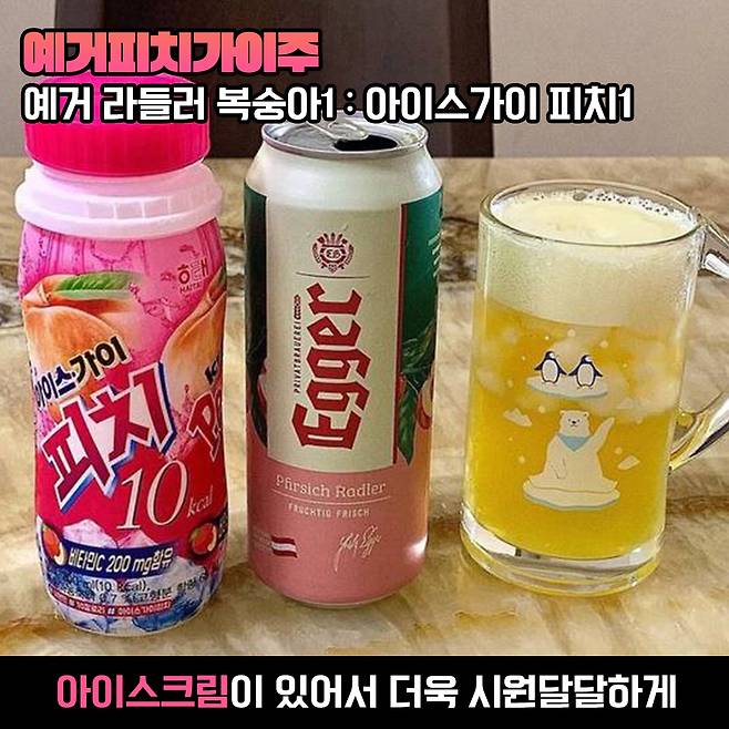아이스크림을 먼저 넣은 후 예거 라들러를 넣으면 되는데 두 조합을 합쳐버리면 아이스가이 피치가 술맛을 아이스크림으로 대체되어 마지막도 달달한 복숭아 맛을 느낄 수 있답니다. 이것은 복숭아 음료수인가 복숭아 맥주인가!