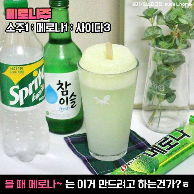 다양한 아이스크림과 술 조합이 있지만 가장 먼저 생각나는 메로나주! 소주와 메로나 그리고 사이다까지 넣어주어야 메로나주가 완성된답니다. 메로나가 얼려져 있어서 사이다와 소주를 섞을 때 메로나를 저어주는 것이 포인트랍니다^^