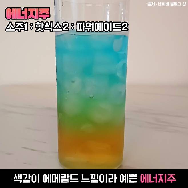 소주→핫식스→파워에이드 순으로 넣으면 마시는 순간만큼은 주인공이 될 수 있는 비주얼을 가진 에너지주! 색감이 에메랄드빛이라 너무 예뻐서 모두의 시선을 빼앗을 수 있는 술입니다.