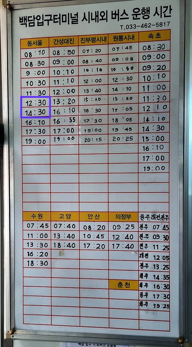 엊그제 다녀온듯 코스가 익숙했고 중간에 새로운 쉼터가 생겼더군요 그리고 백담사입구터미널에서 동서울로 가는 버스시간이 변경되어서 시간표를 우선 올립니다. (승차권 구입처 매점에 물어보니 수개월전에 변경됐다고 하는데 지자체 교통편 검색에서는 아직 이전 시간표로 나오네요)