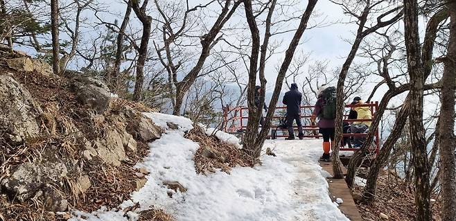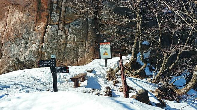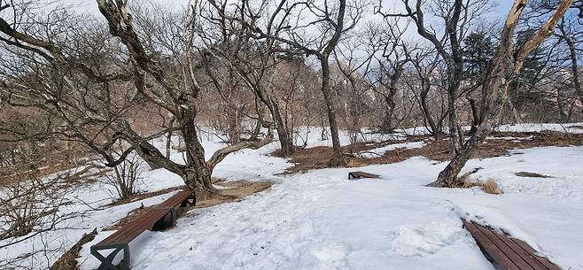 1307봉 이후에는 눈이 제법 쌓여있어서 아이젠을 착용. 내리막 이후 안부에 있는 괴목 근처에도 벤치 3개가 새로 설치되었네요.