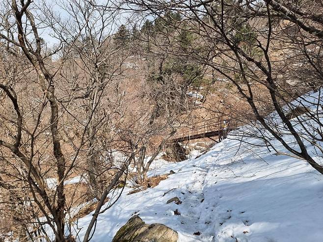 아주 좁은 등로같아 보입니다. 다리가 생기기전에 이용했던 옛길이 아닌가 싶네요. 관음폭포까지 다리 2개를 건너지 않고 이동 가능해 보입니다.