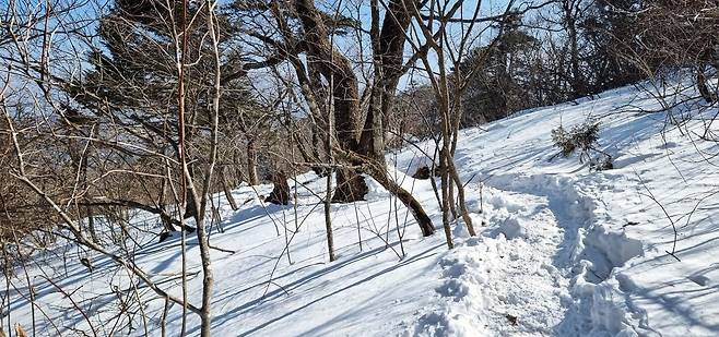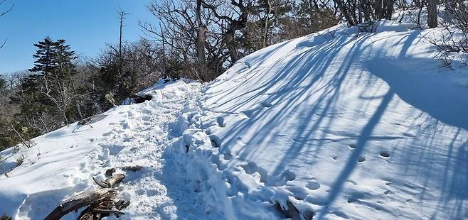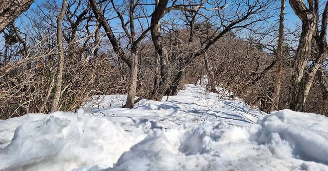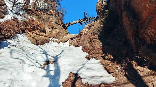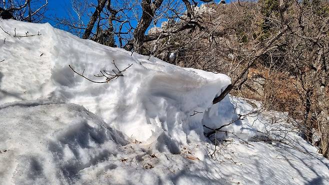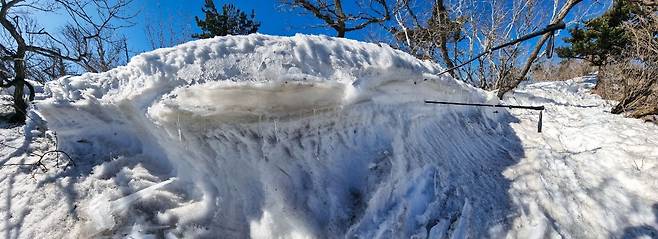 눈으로 메워져 걷기 편하게 변한 너덜지대