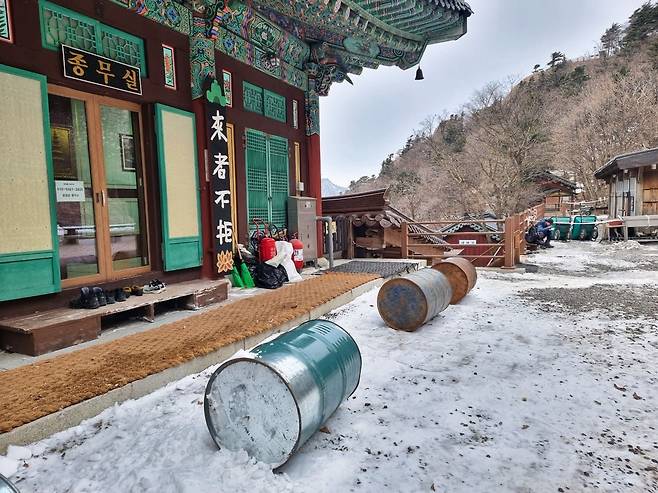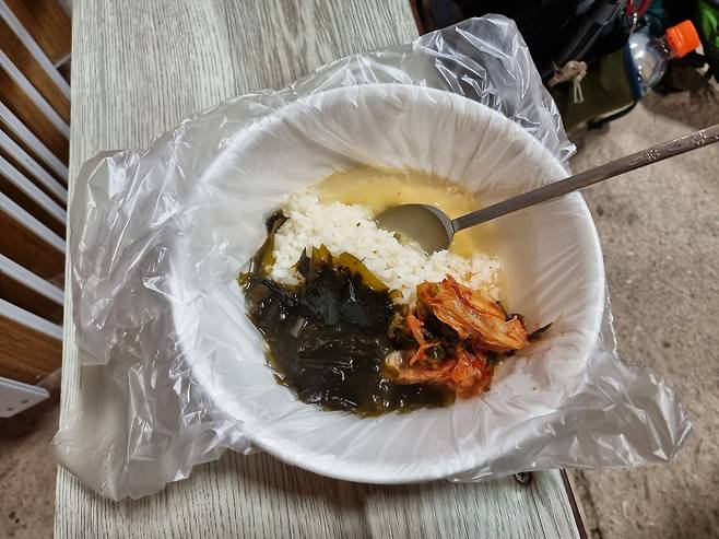 봉정암 공양, 겨울철은 설거지 물이 부족해 비닐에 씌워서 먹습니다