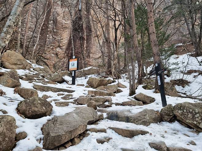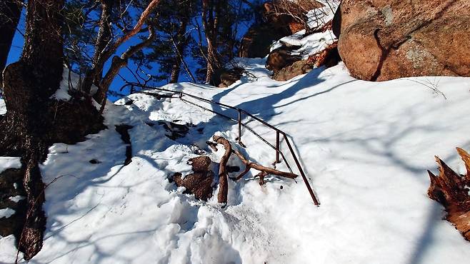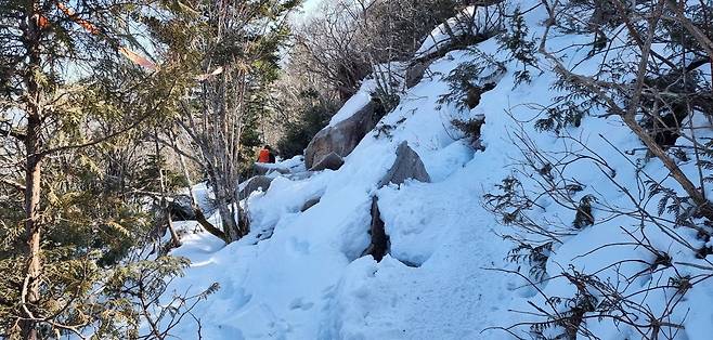 봉정암 직전에 맞이한 급경사 눈길