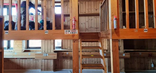 2층 2대피실만 배정받다가 처음으로 1층에 있는 1대피실에 배정받었습니다. 105번~101번은 중간에 전기콘센트가 있고 하단침상은 바닥난방도 됩니다.