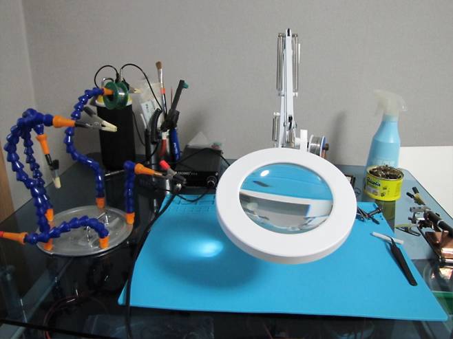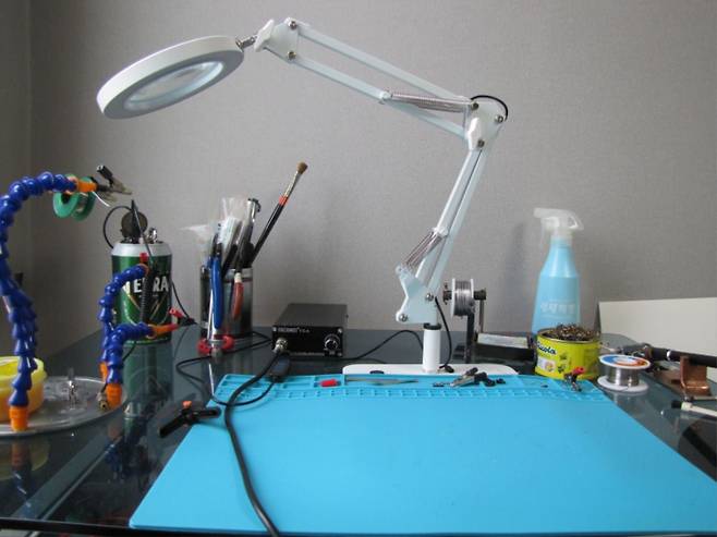 이어폰 Diy를 위해서 영입한 스윙 암 30배율 돋보기 led가 들어오니 선명하게 부품을 볼수 있어