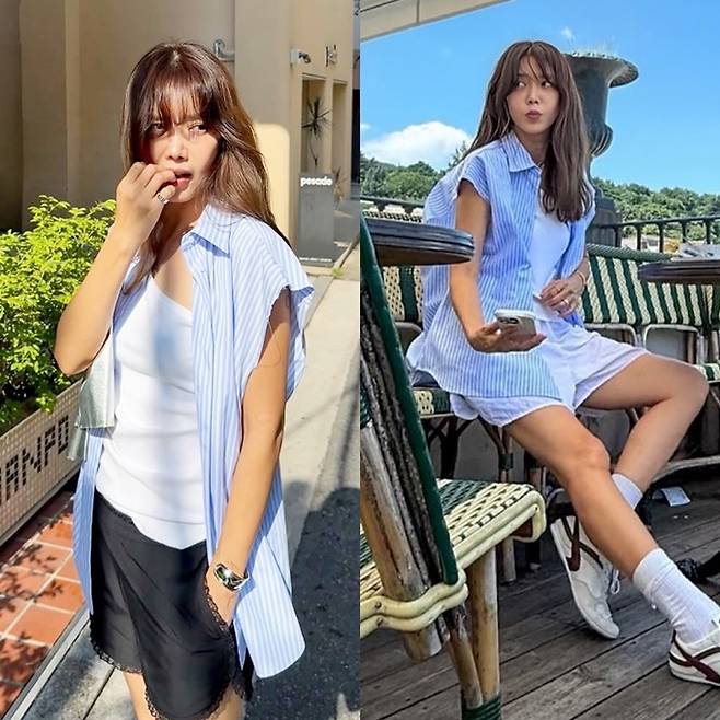 공개한 사진에서 채정안은 블랙과 화이트 반바지에 화이트 민소매 티셔츠를 입고 팔 라인이 커팅된 블루 컬러의 스트라이프 셔츠를 걸친 외출룩으로 스타이일리시하면서도 쿨한 여름 패션을 완성했다.