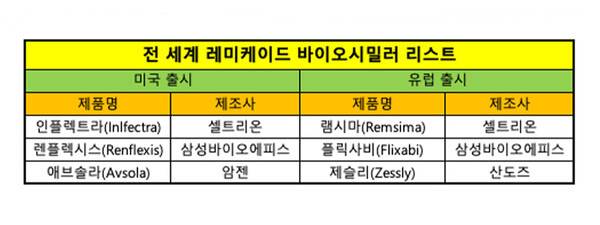 19일 업계에 따르면 레미케이드는 존슨앤드존슨이 개발한 '종양괴사인자 알파(TNF-α)' 억제제로 류머티스관절염, 크론병, 궤양성대장염 등 자가면역질환을 치료하는 블록버스터 의약품이다. 유럽에서는 2015년, 미국에서는 2018년 물질특허가 만료된 것으로 알려졌다. 현재 유럽과 미국을 중심으로 셀트리온, 삼성바이오에피스, 암젠, 산도즈 등이 점유율 경쟁을 벌이고 있다.