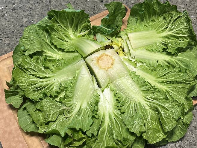 잎을 하나하나 떼어내기보다 봄동 심지 중심으로 네모나게 자릅니다. 이렇게 하면 억센 심지와 이파리 부분을 쉽게 분리할 수 있습니다.