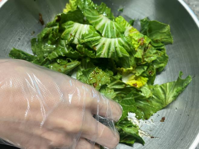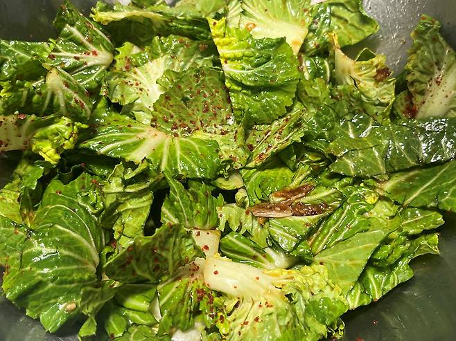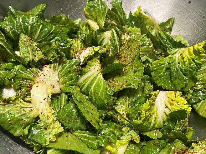 봄동에 양념 넣고 버무립니다. 너무 강하게 빡빡 문지르면 잎이 짓눌려 풋내가 날 수 있으므로, 가볍게 털어내듯 살살 버무려주세요.