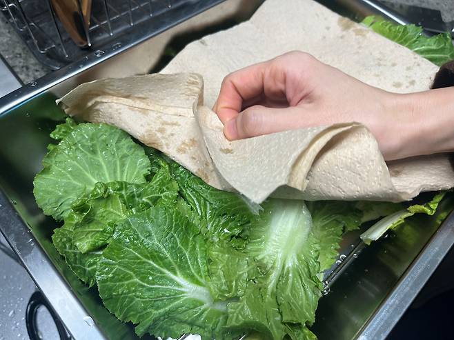 봄동 잎 사이사이에 남은 물기가 양념을 희석해 금방 숨이 죽게 만들기 때문에, 무치기 전 키친타월로 한 번 더 꼼꼼하게 닦습니다. 그리고 적당한 크기로 자르세요.