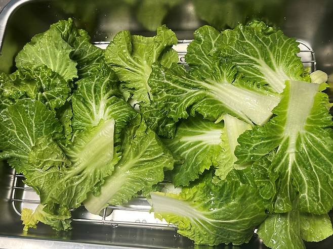 잎의 뒷면과 줄기 안쪽을 꼼꼼히 씻어낸 뒤, 체에 밭쳐 물기를 완전히 제거해야 나중에 양념을 버무렸을 때 물이 생기지 않고 아삭한 식감을 끝까지 유지할 수 있습니다.