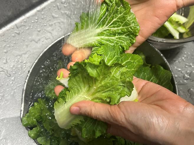 손질된 봄동은 겹쳐진 잎 사이사이에 흙이나 이물질이 남아있을 수 있으므로 세척 과정이 매우 중요합니다. 넉넉한 크기의 볼에 물을 가득 받아 봄동을 잠시 담가두었다가 흐르는 물에 서너 번 반복해서 헹궈주세요.