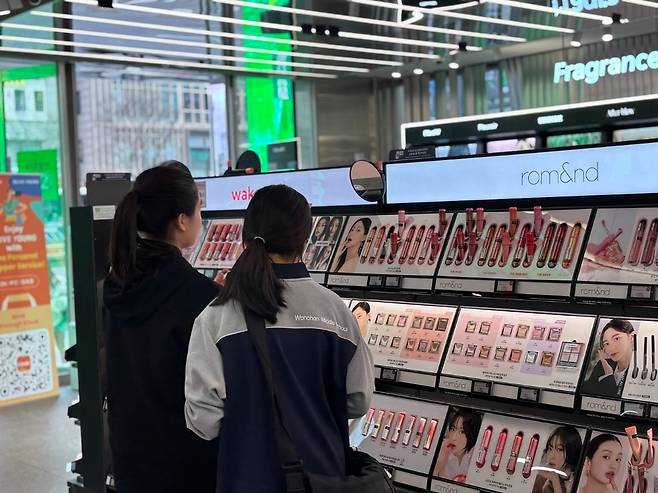 올리브영에서도 어린 학생들이 직접 제품을 발색하고 테스트하는 모습을 쉽게 찾아볼 수 있다. 성인 여성처럼 손등에 제품을 발라보거나 매장 내 테스트용 화장품을 직접 얼굴에 사용해보는 등 능숙한 모습도 보인다.
