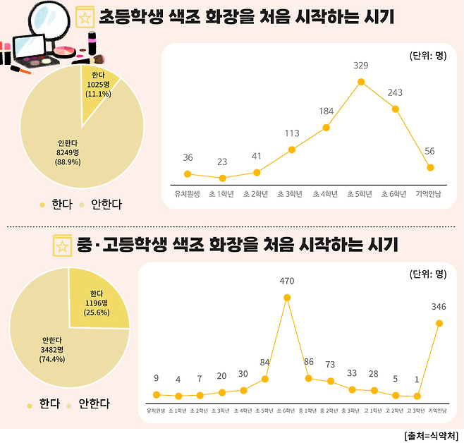 식품의약품안전처가 지난 2월 발표한 ‘초·중·고등학생 화장품 사용 현황’에 따르면, 지난해 5월부터 11월까지 조사 결과 초등학생 10명 중 1명이 색조화장을 하고 있으며, 중·고등학생 화장 인구 중 약 40%는 초등학교 6학년부터 색조화장을 시작한 것으로 나타났다.