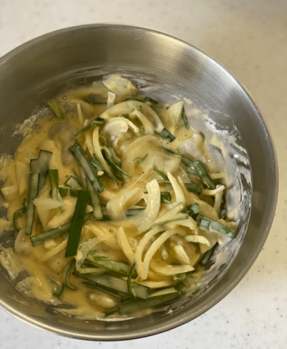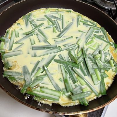 밀가루만 사용했을 때보다 맛도 훨씬 깊어진다. 계란은 전을 오래 유지할 때도 식감이 덜 뻣뻣해지게 도와주기 때문에 꼭 넣는 것이 좋다. 부추처럼 수분 많은 재료와도 잘 어울린다.