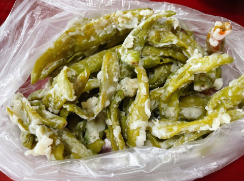 꽈리고추에 밀가루를 넣고 골고루 버무립니다.(찜기에서 잘 익고 양념이 잘 스며들어요!)