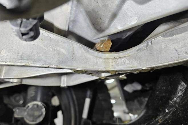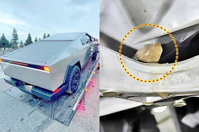 테슬라 사이버트럭 소유주 조이 애로우드(Joey Arrowood)는 최근 차량 하부에서 상당한 양의 기름이 새어 나온 것을 확인했다. 서비스 센터에 방문해 차량을 점검받은 결과 주행 중 튀어 오른 작은 돌멩이가 손상을 일으킨 것으로 나타났다. 운 나쁘게도 돌멩이 서브 프레임과 후륜 기어박스에 끼어 구멍이 생겼고, 윤활유가 모두 새어나간 것이다.