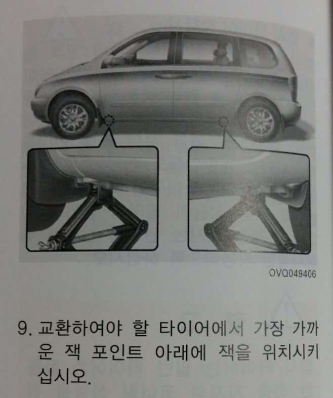찾는 방법: 보통 자동차의 앞바퀴 뒤쪽과, 뒷바퀴 앞쪽의 차체 하단부, 즉 사이드 실(Side Sill) 패널 부분을 보면, 작은 삼각형(▲) 모양이 양각으로 새겨져 있거나, 홈이 파여 있는 것을 발견할 수 있습니다.