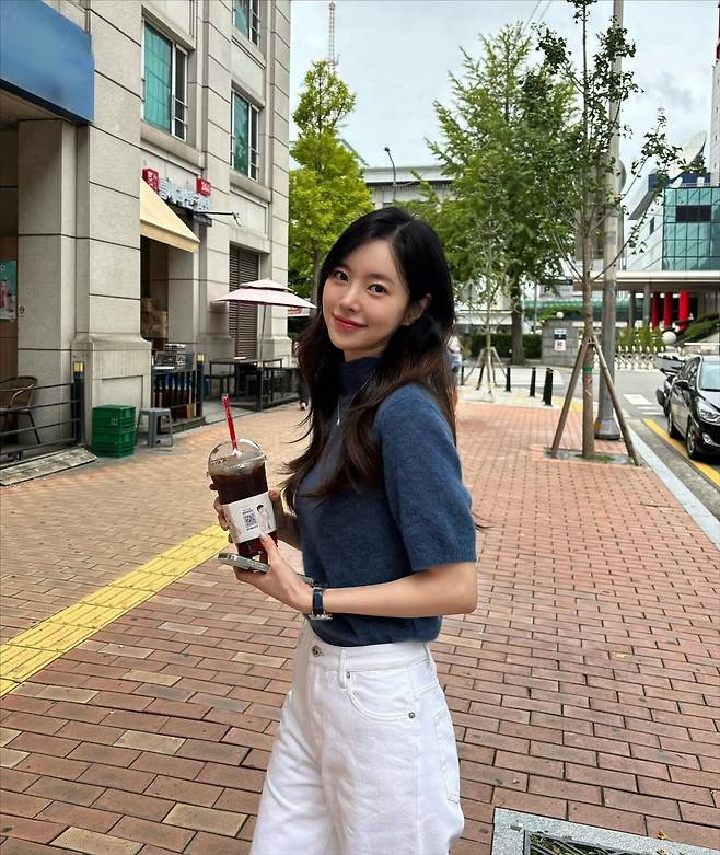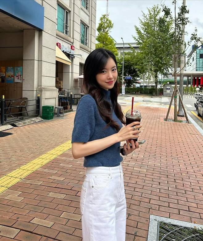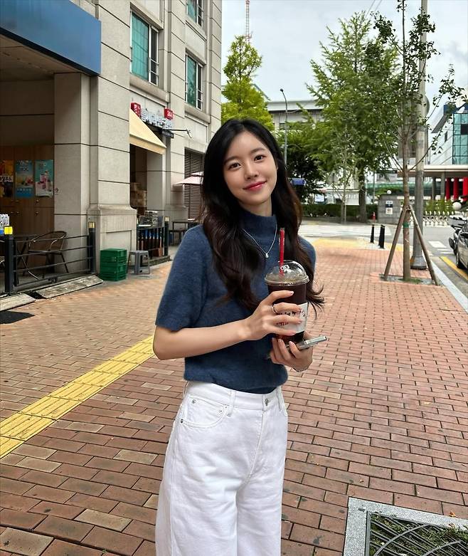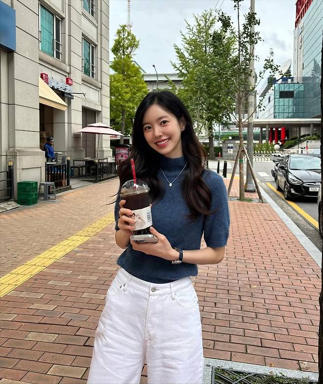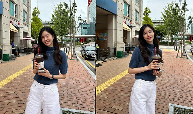 손에 든 아이스 아메리카노와 부드러운 미소가 어우러져 마치 청춘 영화의 한 장면 같은 분위기를 연출했다.